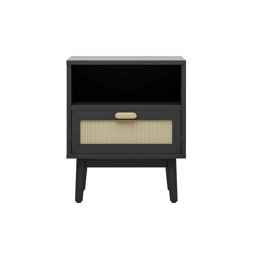 השידות מכילות מגירה בשילוב חזית דמוי ראטן על מסילות לפתיחה נוחה וידית מעוצבת