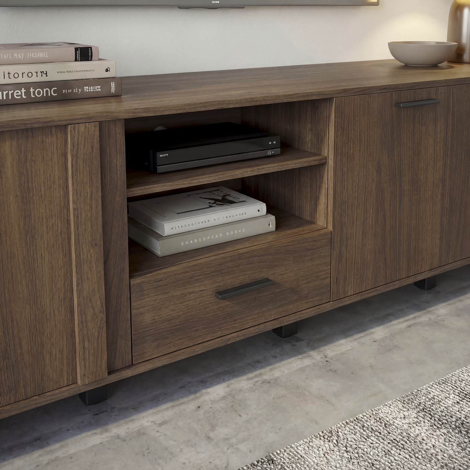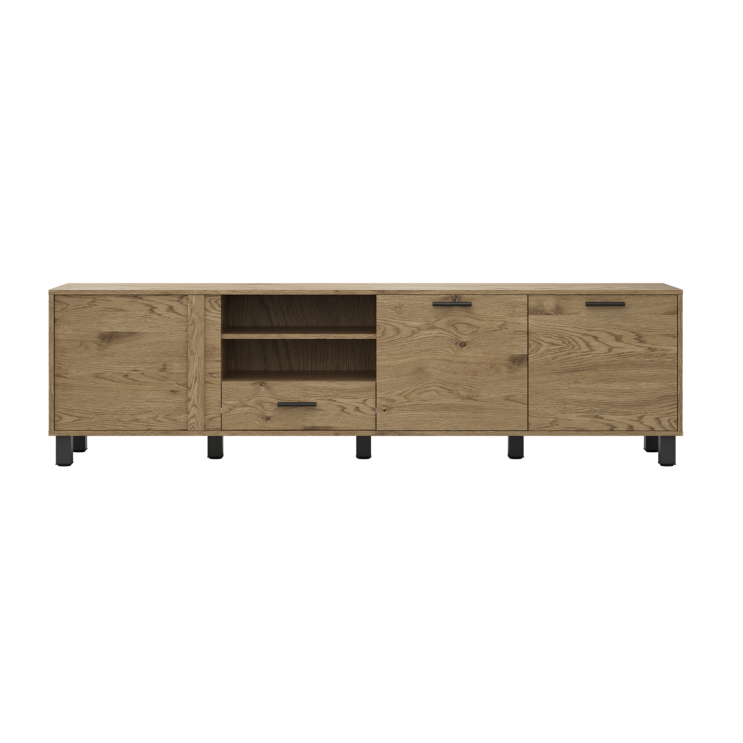 המזנון מציע גם יופי וגם פונקציונליות : שלושה תאי אחסון מרווחים הסגורים בדלתות שני מדפים פתוחים ומגירה על מסילות  לאחסון נוסף