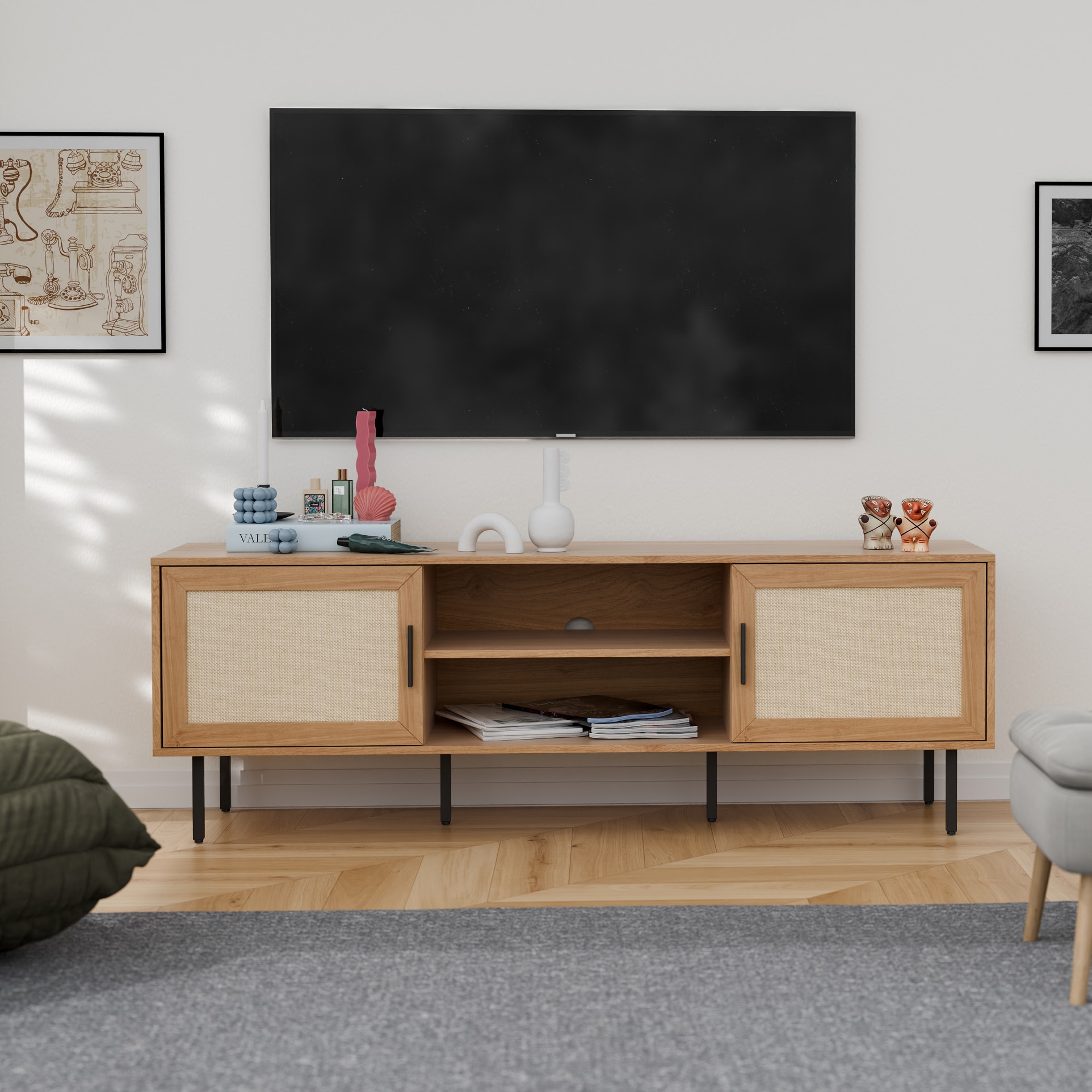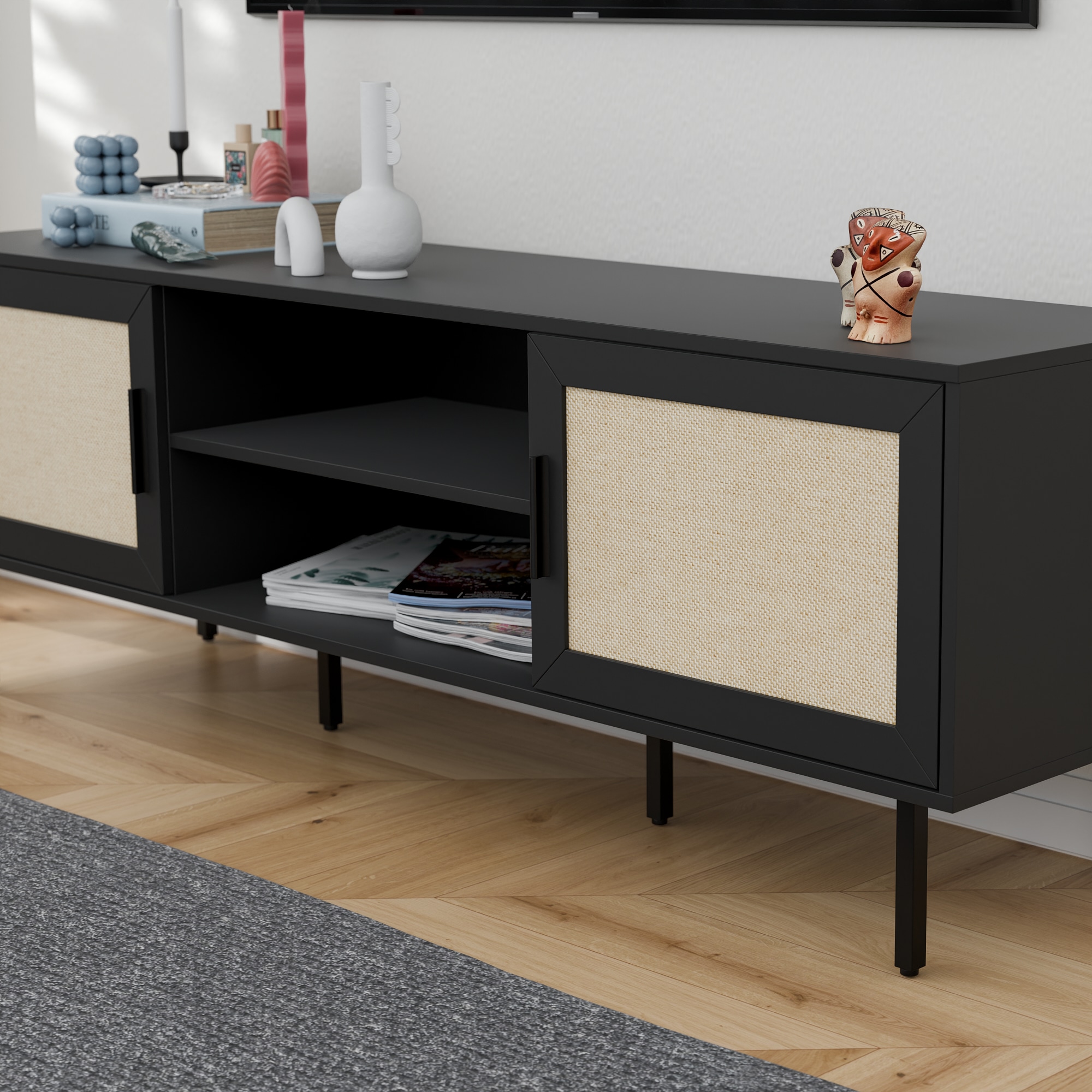 מזנון דגם אלסקה  משלב דלתות מודרניות עם משטח בסגנון ראטן ורגלי מתכת חזקות