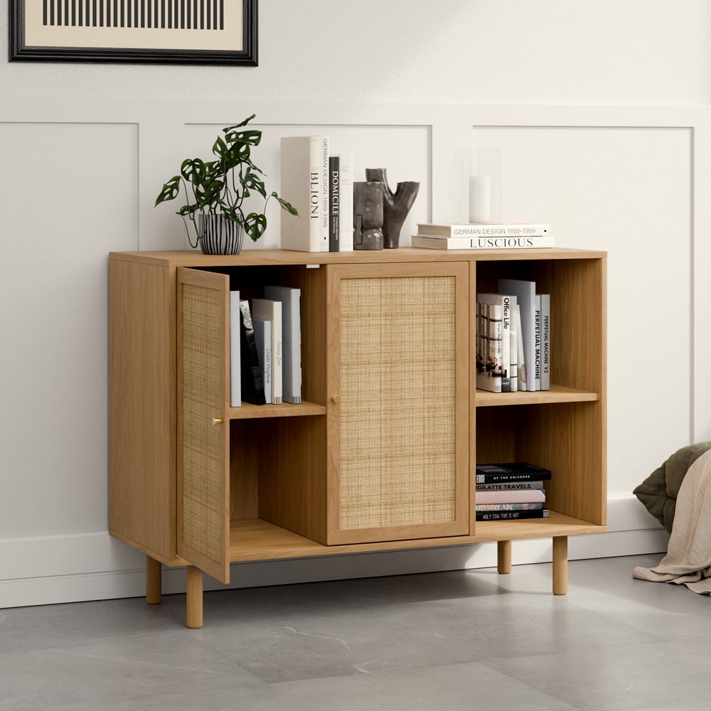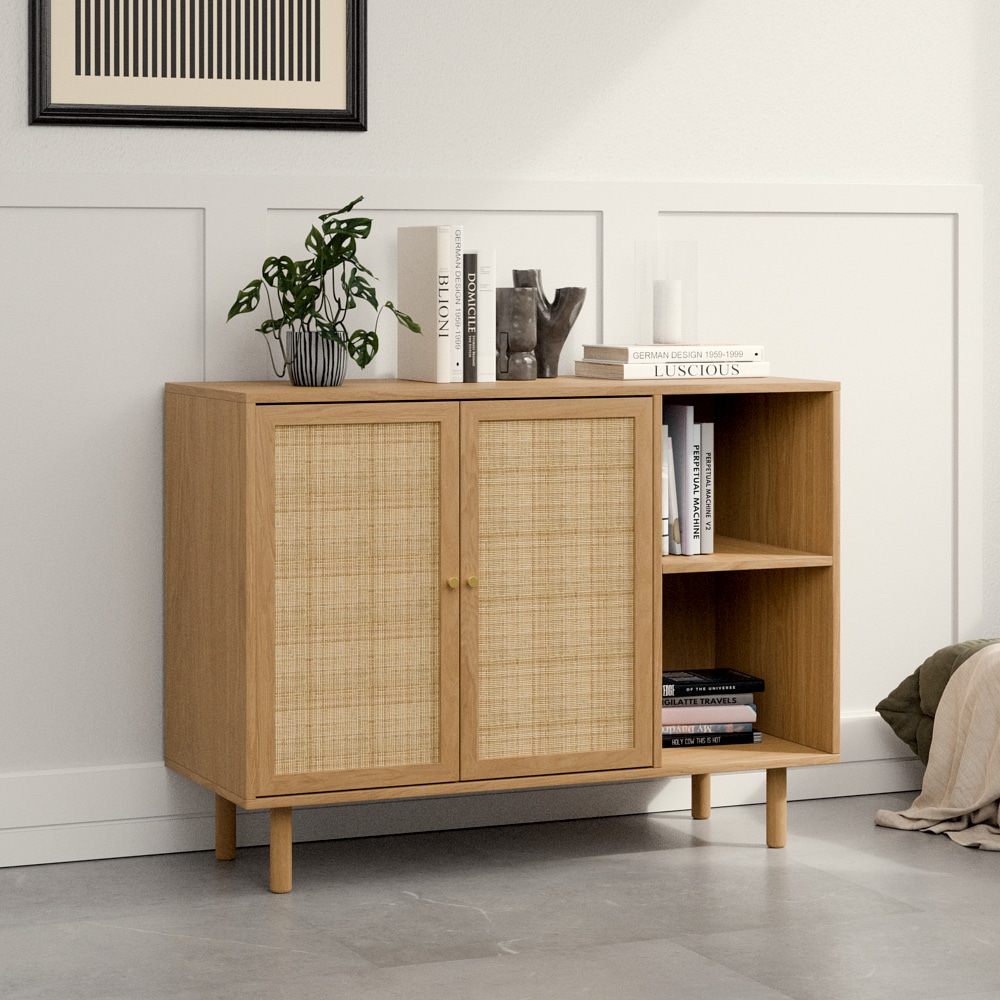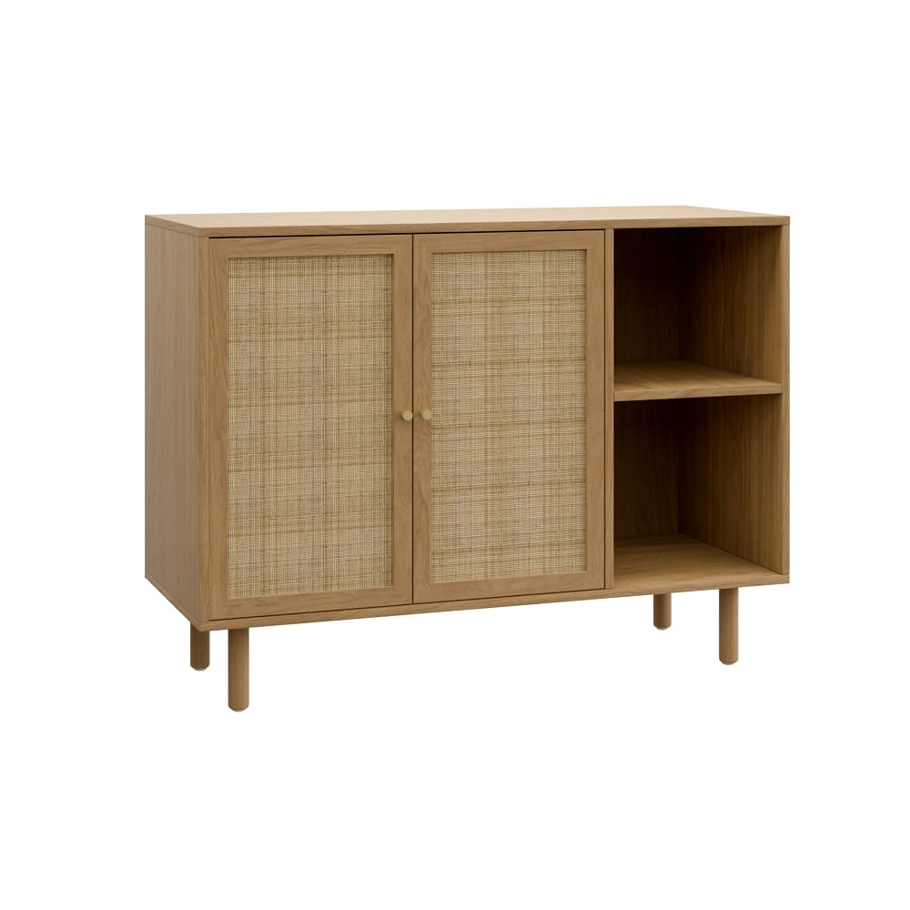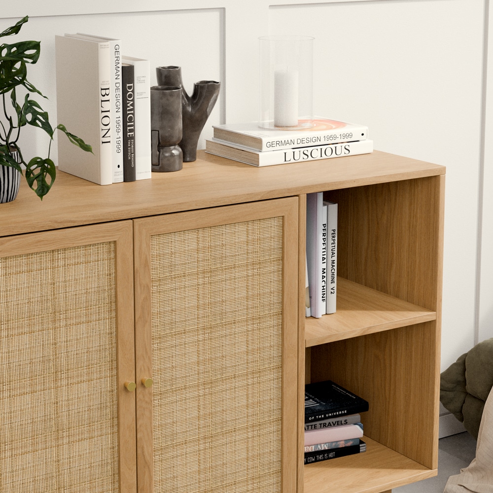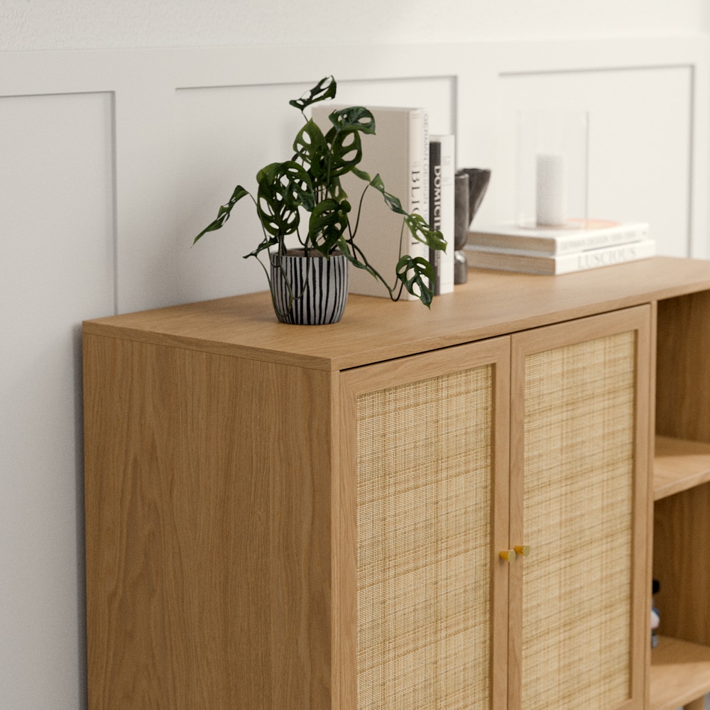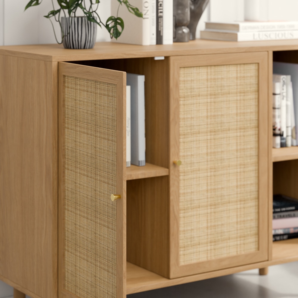 עיצוב סקנדינבי נקי בשילוב מושלם בין מראה עץ טבעי ודלתות בסגנון ראטן שיוצר מראה חם ומזמין