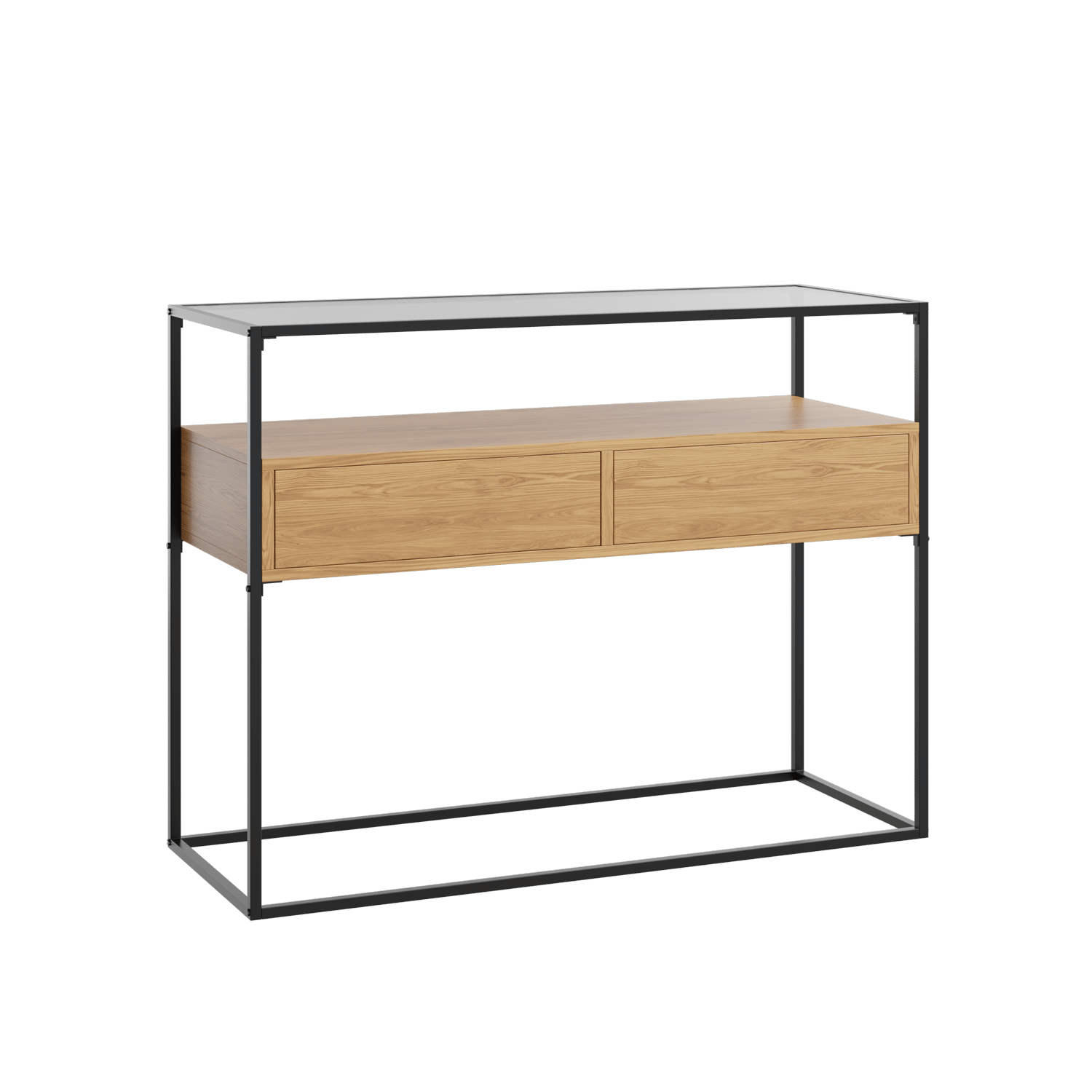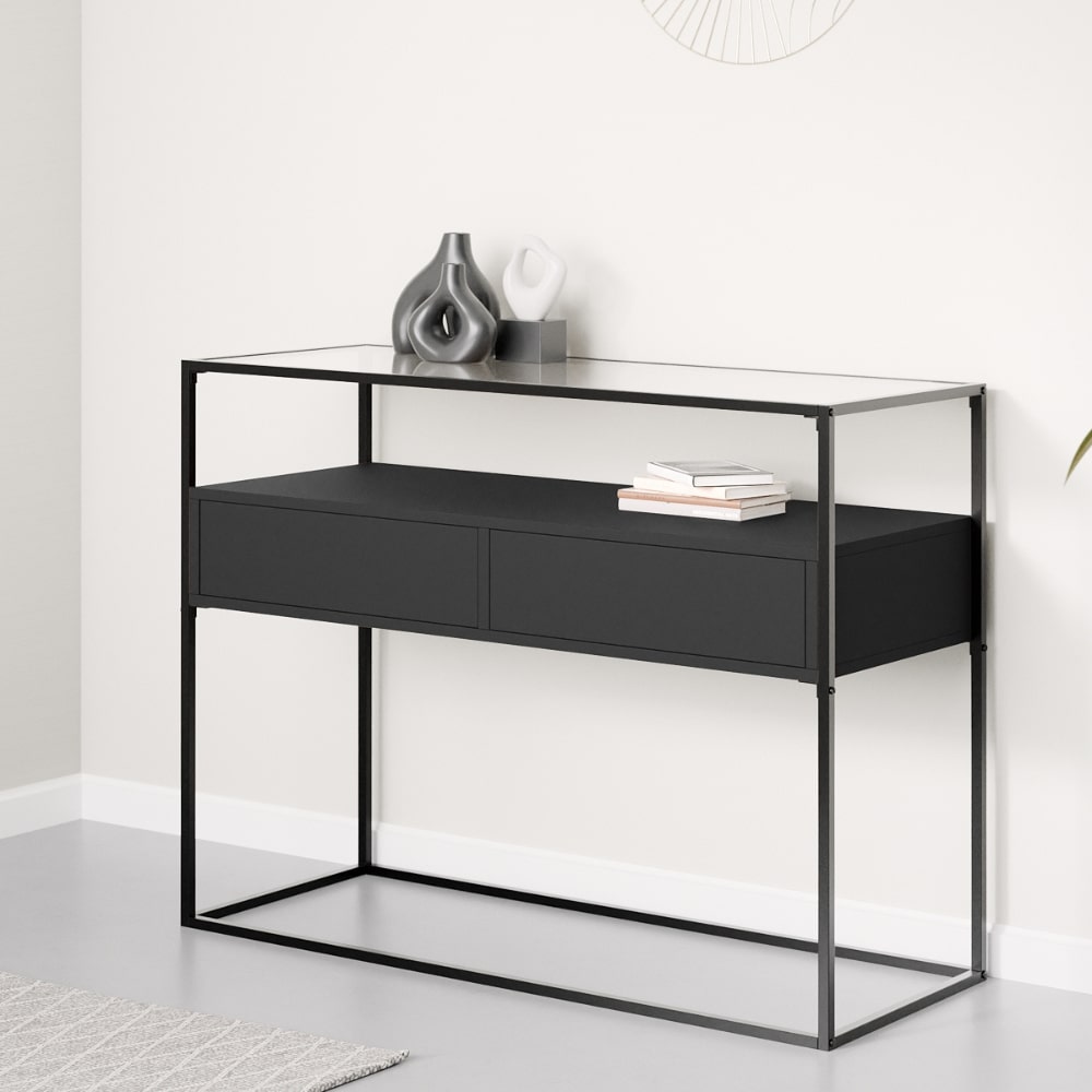 הקונסולה בעלת מסגרת מתכת עם שידת מגירות אמצעית מרחפת ופלטת זכוכית מחוסמת
