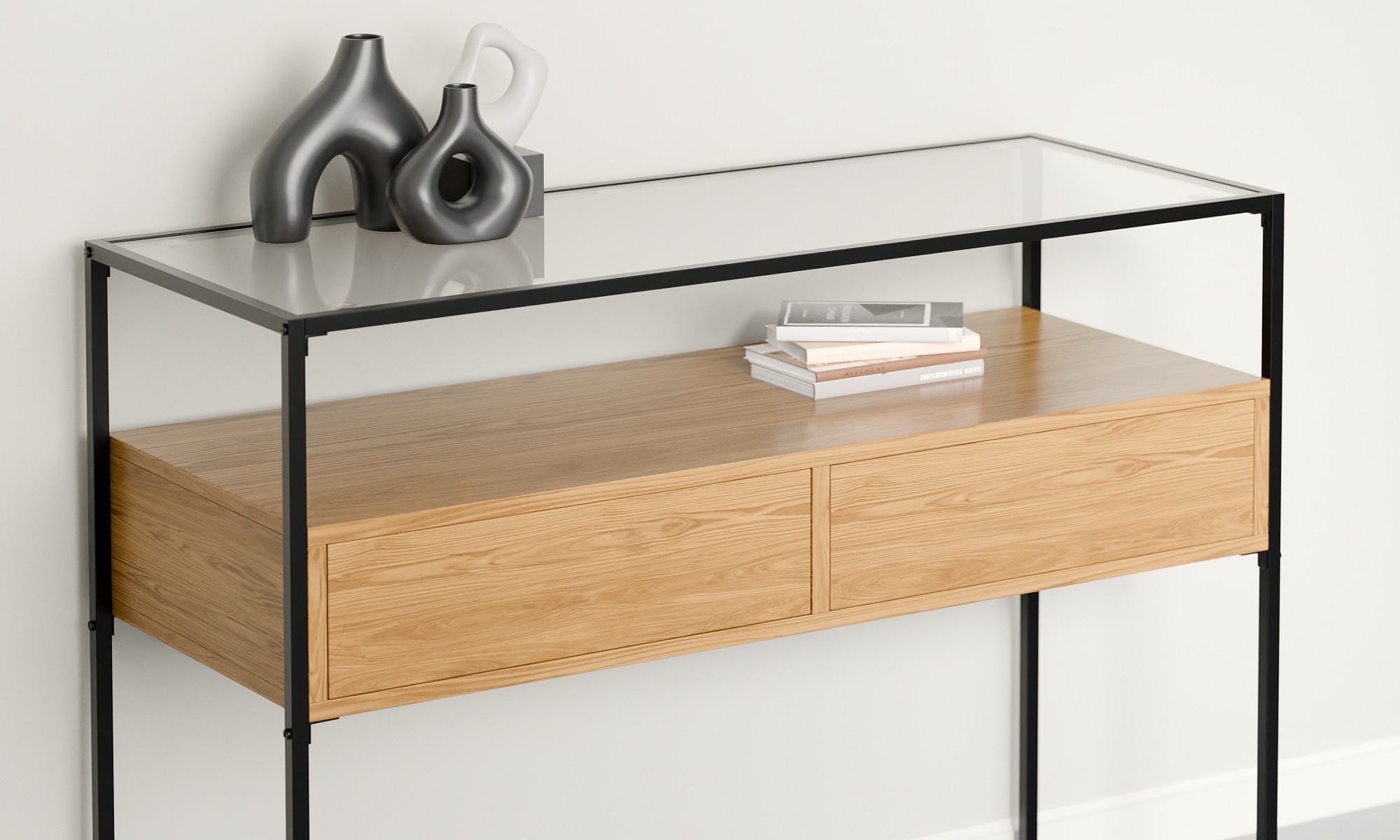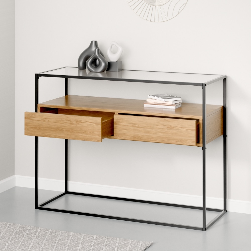 הקונסולה עשויה מרגלי מתכת מושחרות שידת מגירות משבבי עץ מצופים מלמין יוקרתי ופלטת זכוכית מחוסמת איכותית