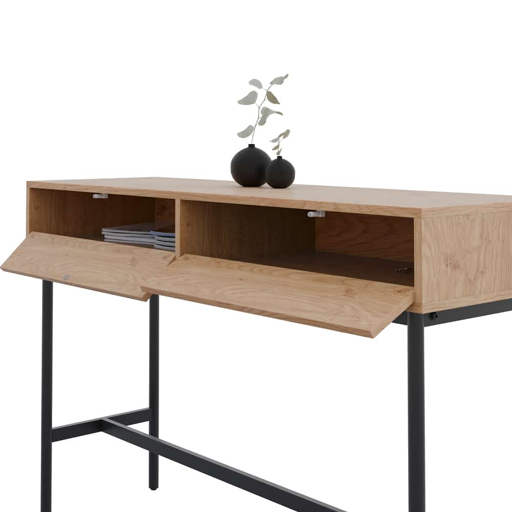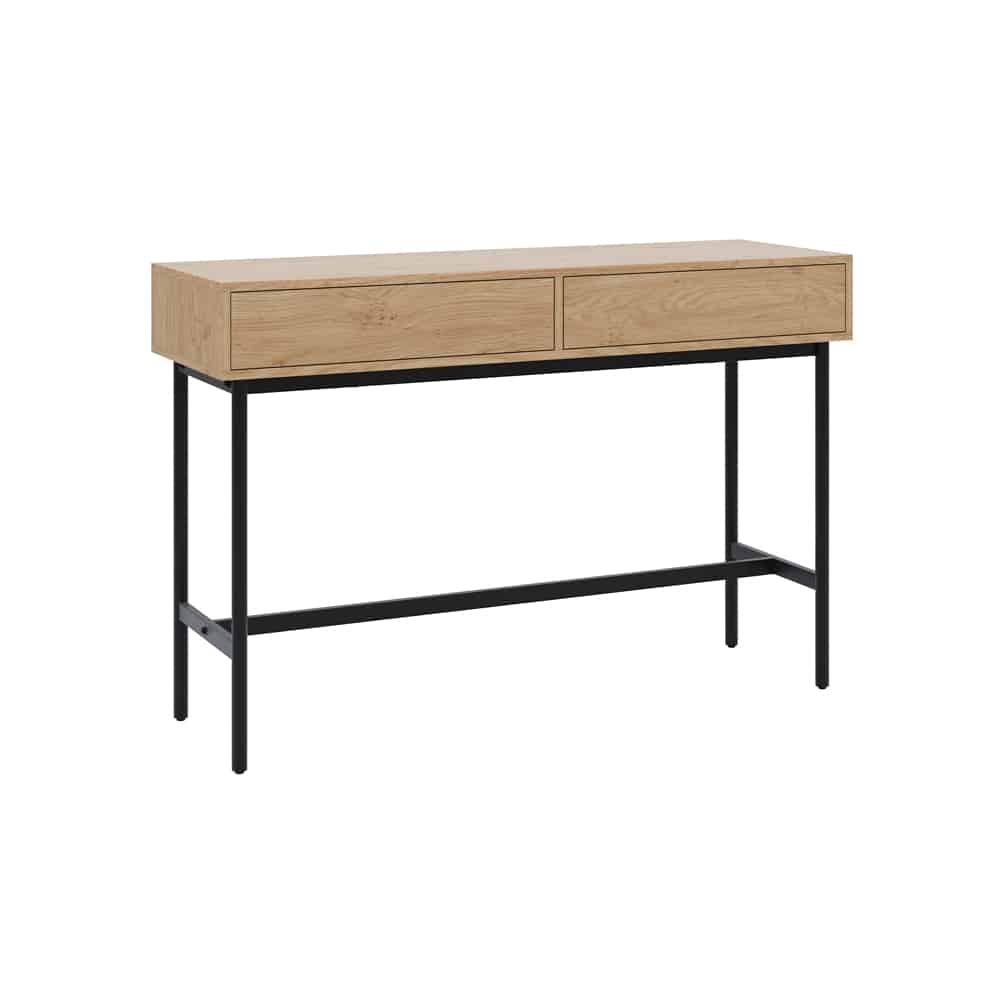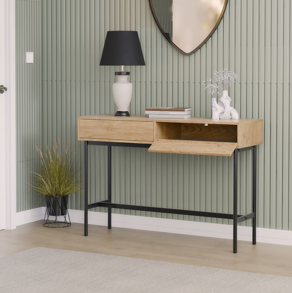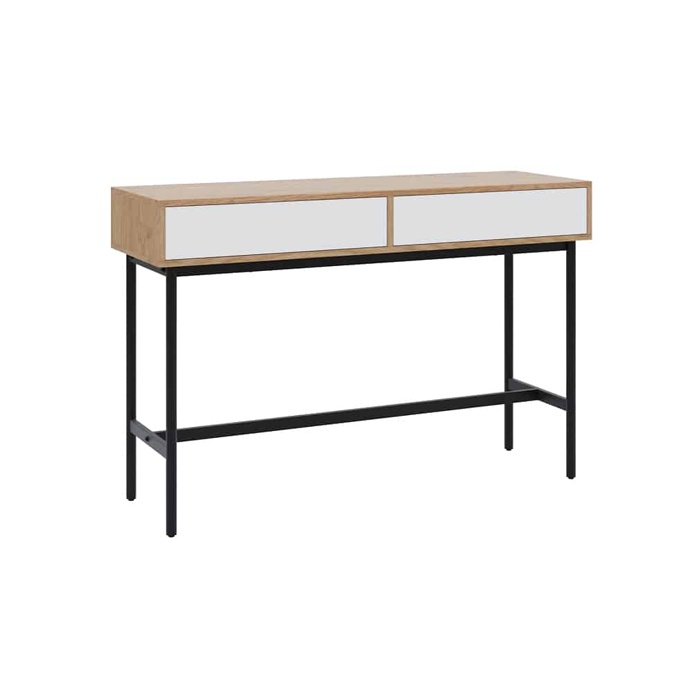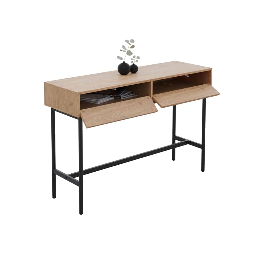 הקונסולה עשויה משבבי עץ בציפוי מלמין יוקרתי ורגלי מתכת חזקות