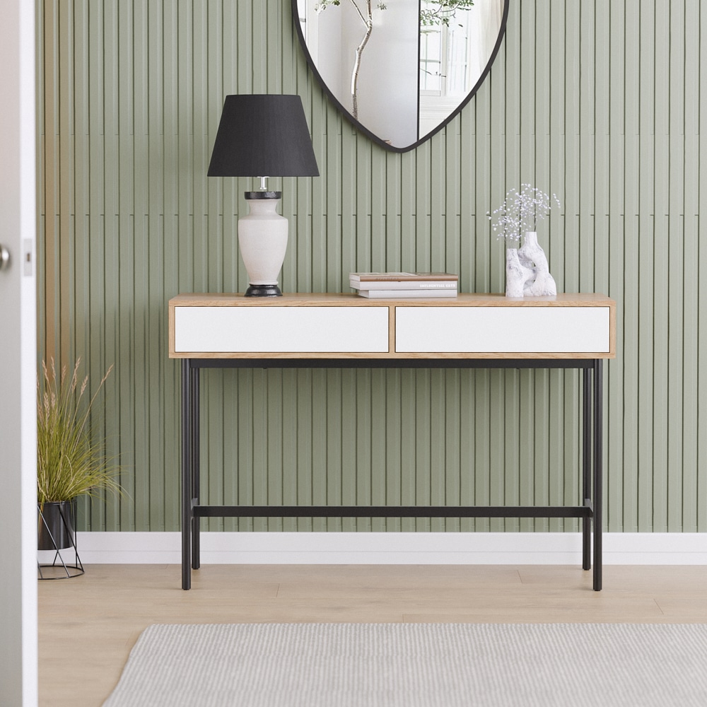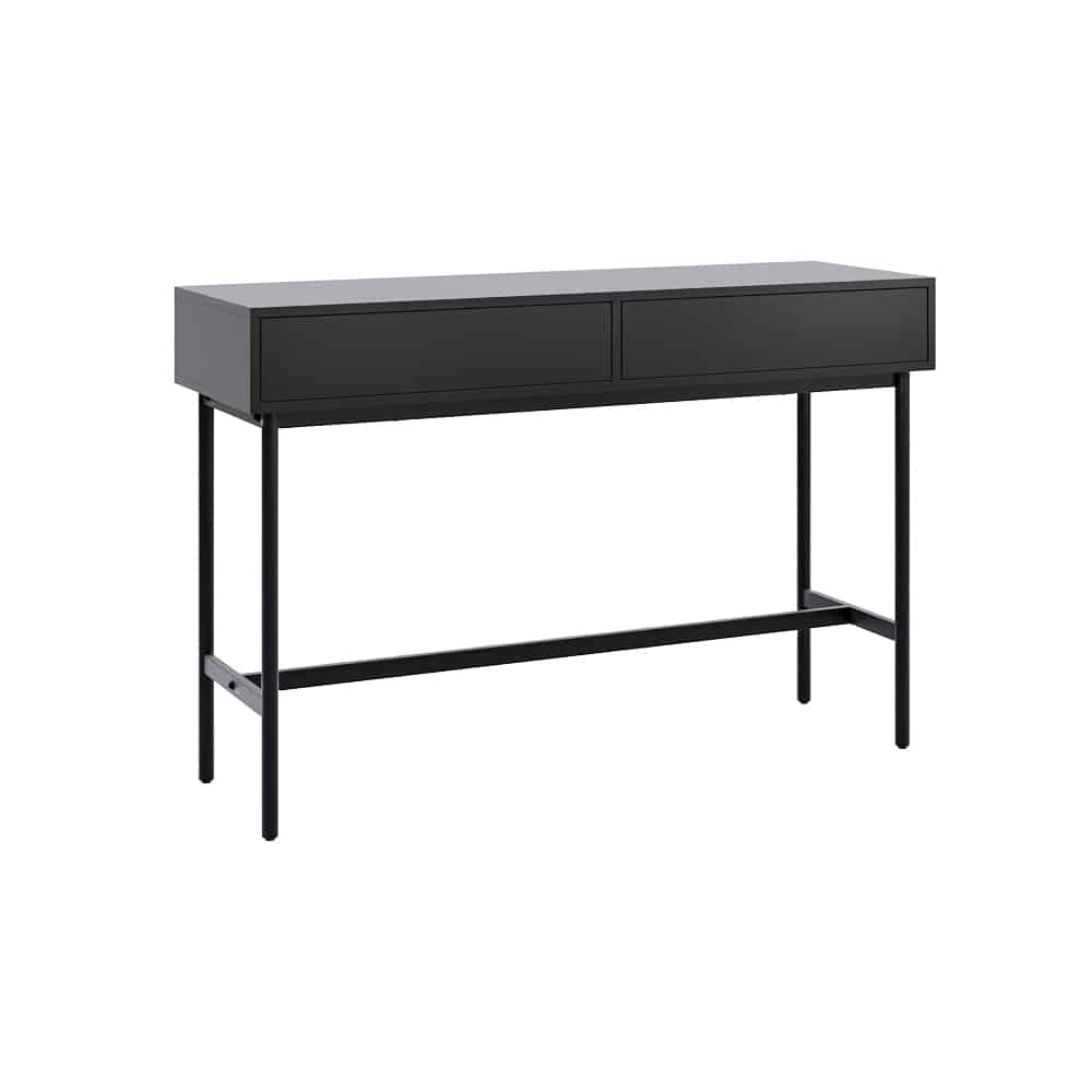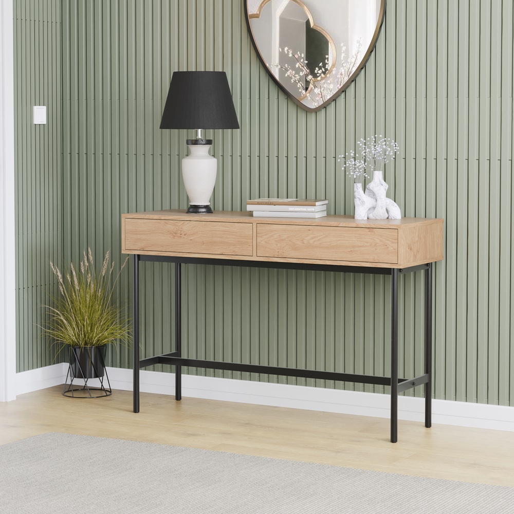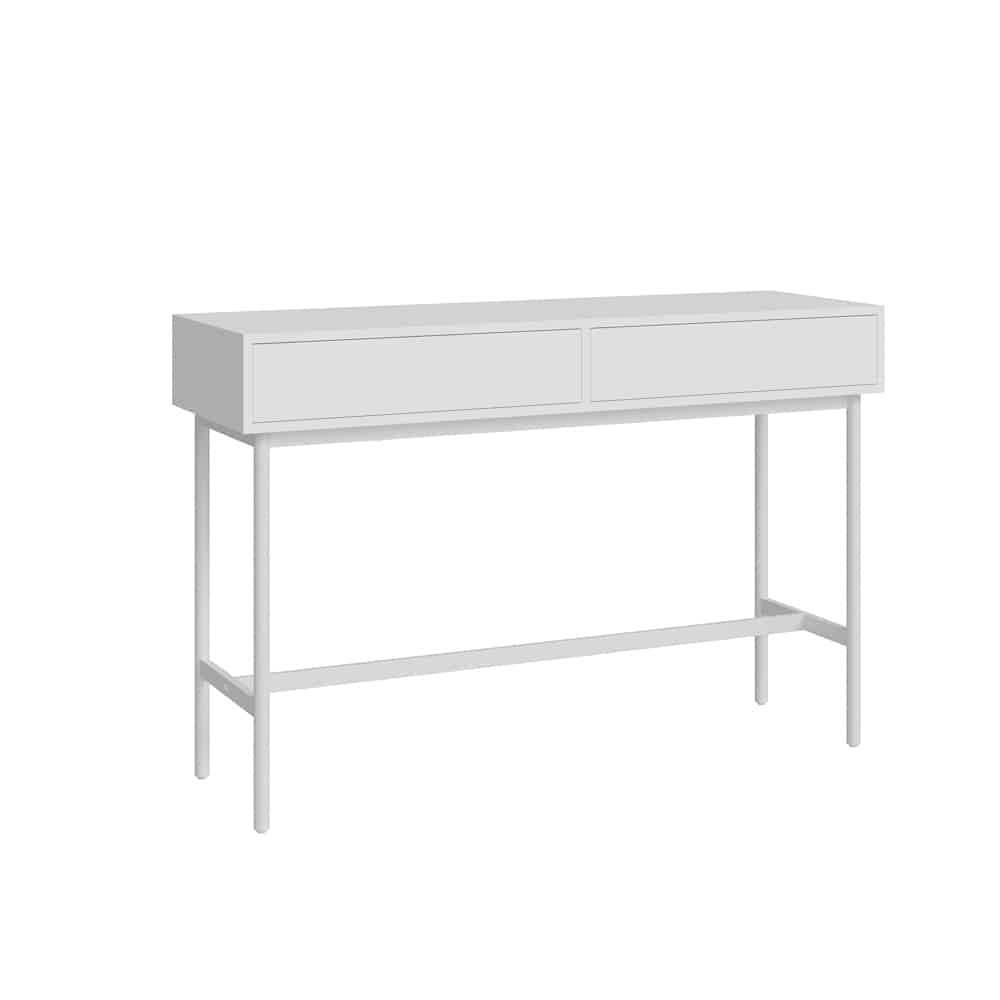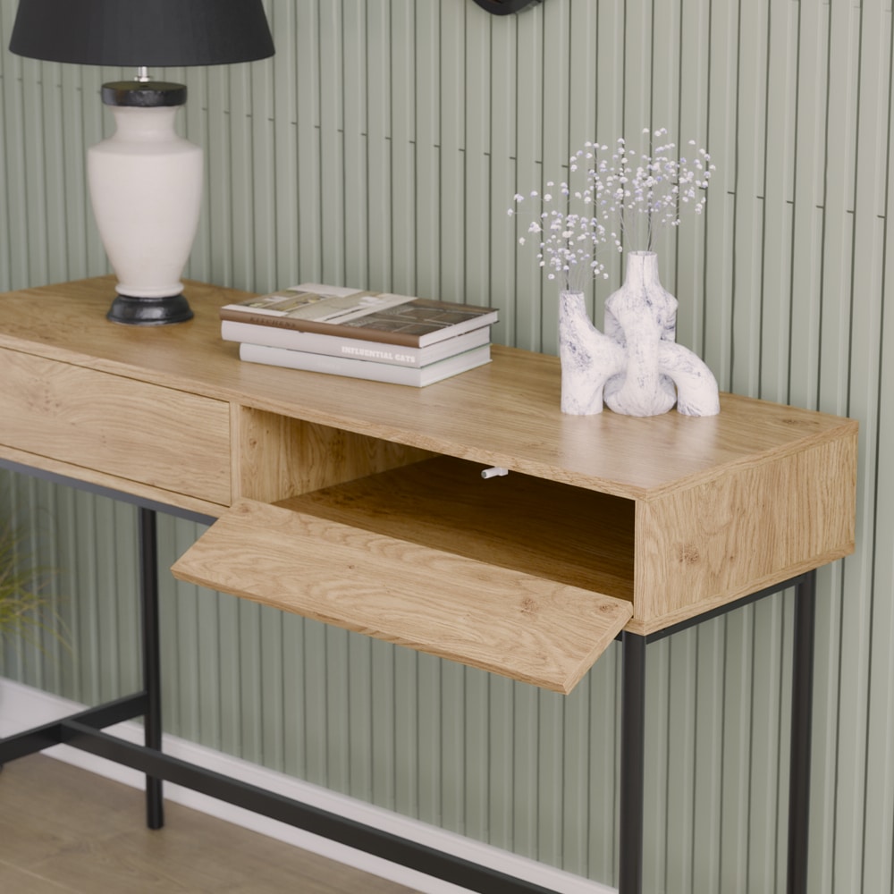 הקונסולה עשויה משבבי עץ בציפוי מלמין יוקרתי ורגלי מתכת חזקות