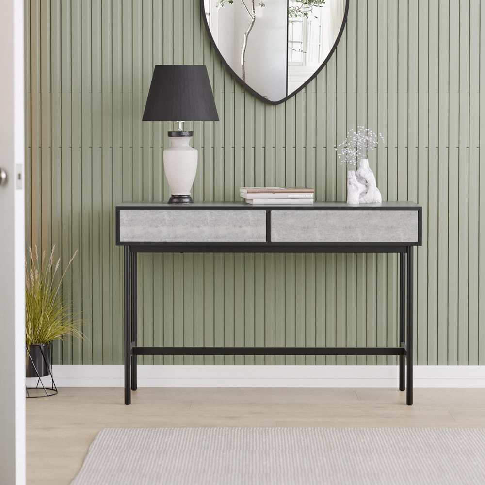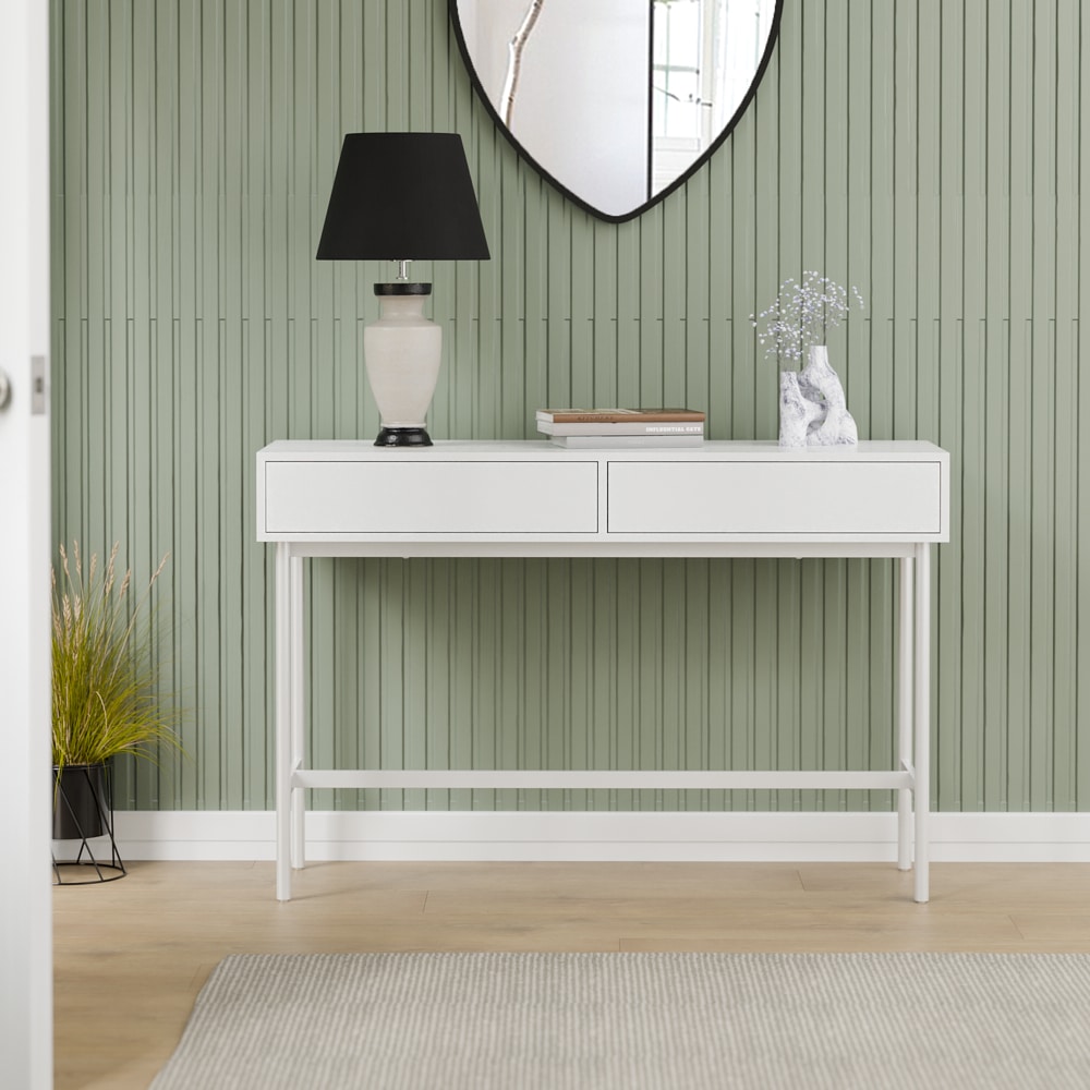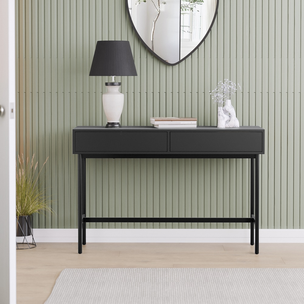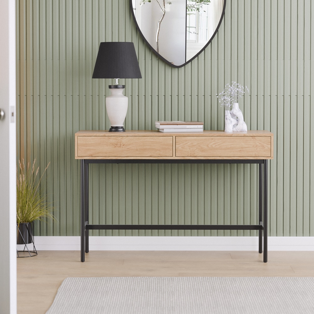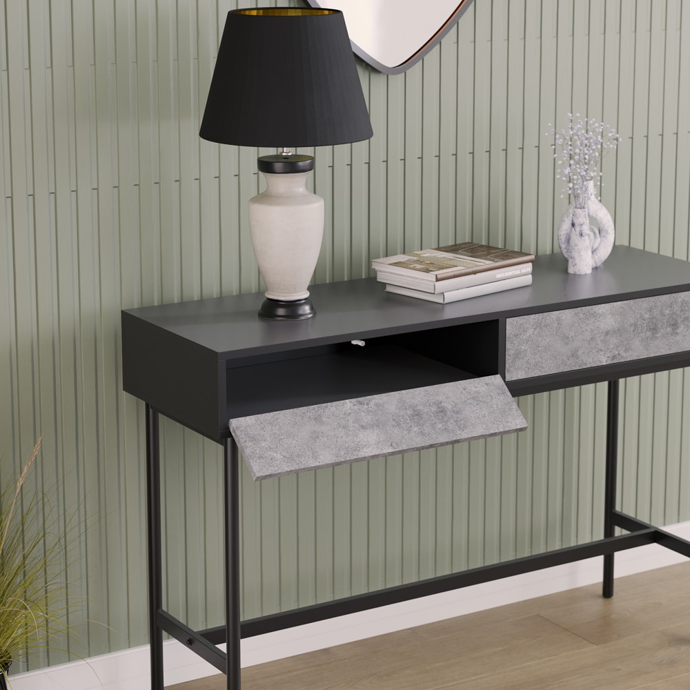 הקונסולה עשויה משבבי עץ בציפוי מלמין יוקרתי ורגלי מתכת חזקות
