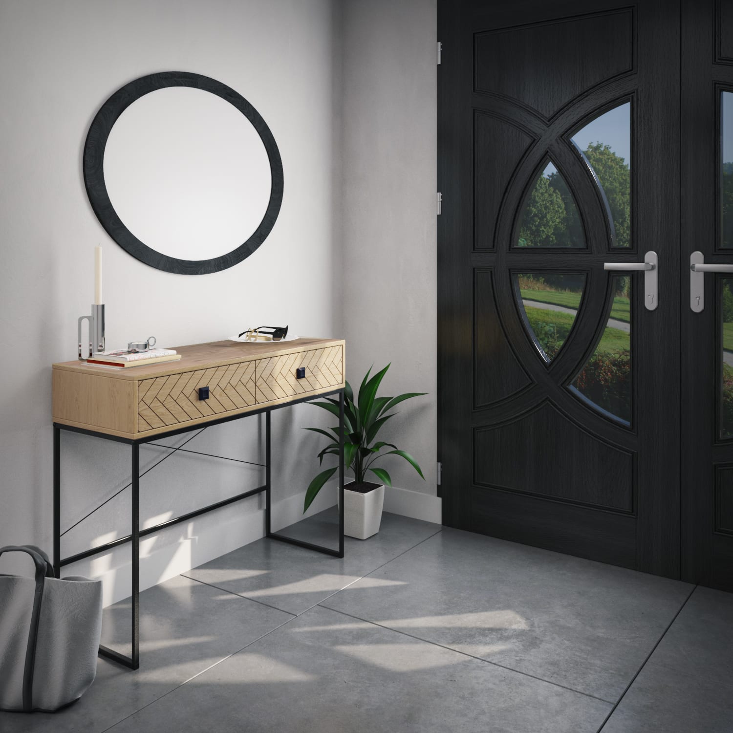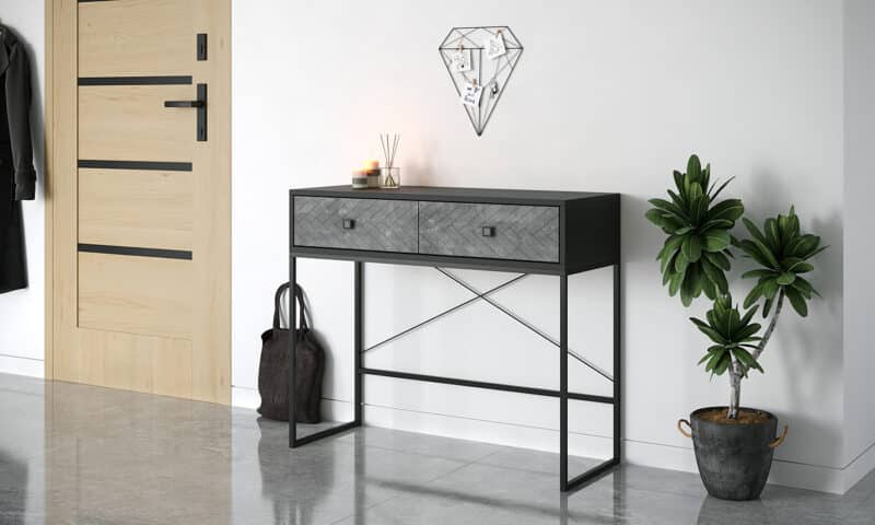 השולחן משמש כשולחן לכניסה לבית ומשלב נוחות עם פתרון אחסון מעולה לשמירה על הסדר והעיצוב