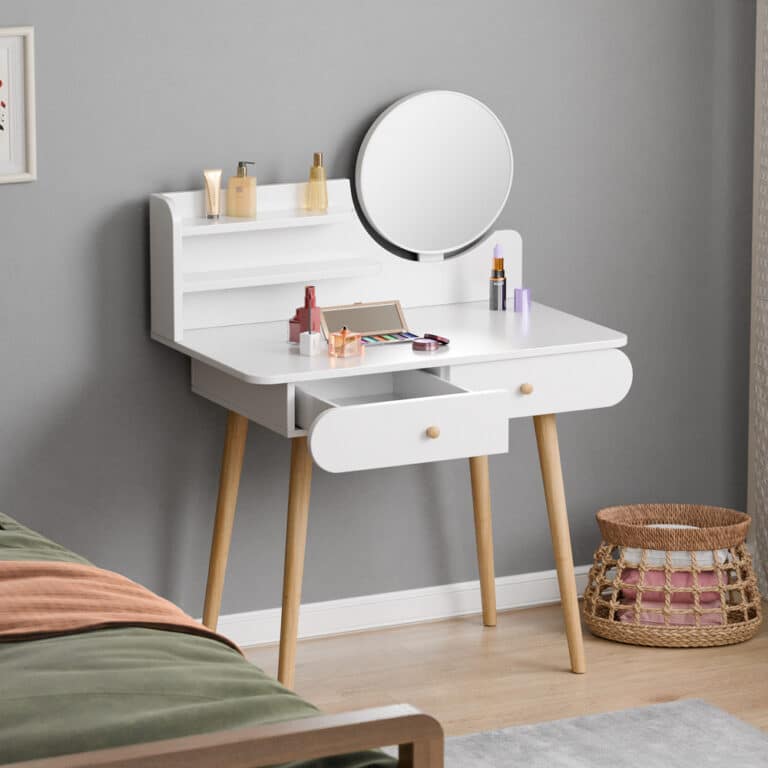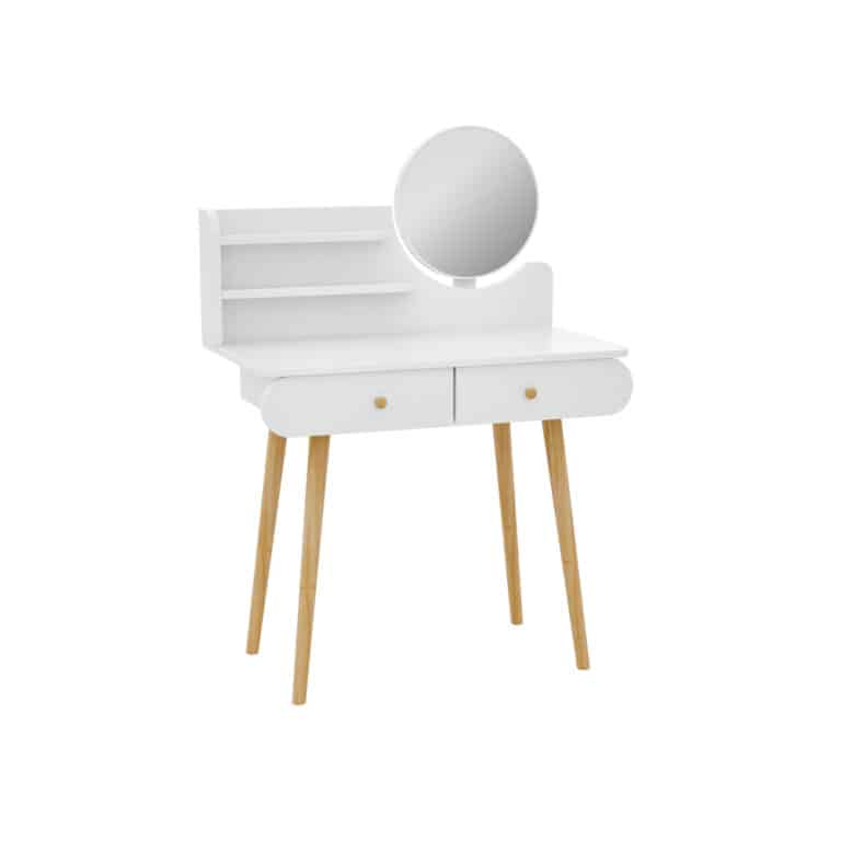 שידת איפור בצבע לבן ומראה גדולה עם רגליים בצבע עץ מודרניות וחזקות