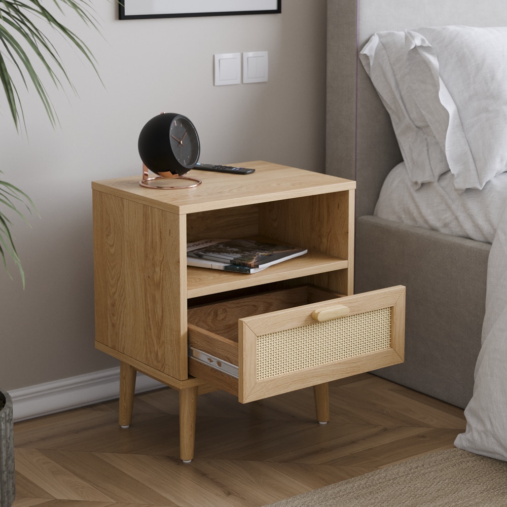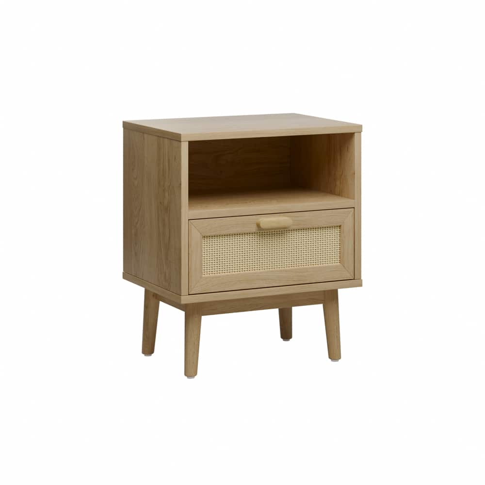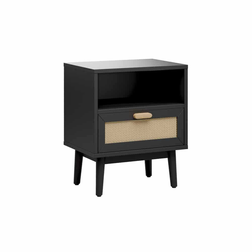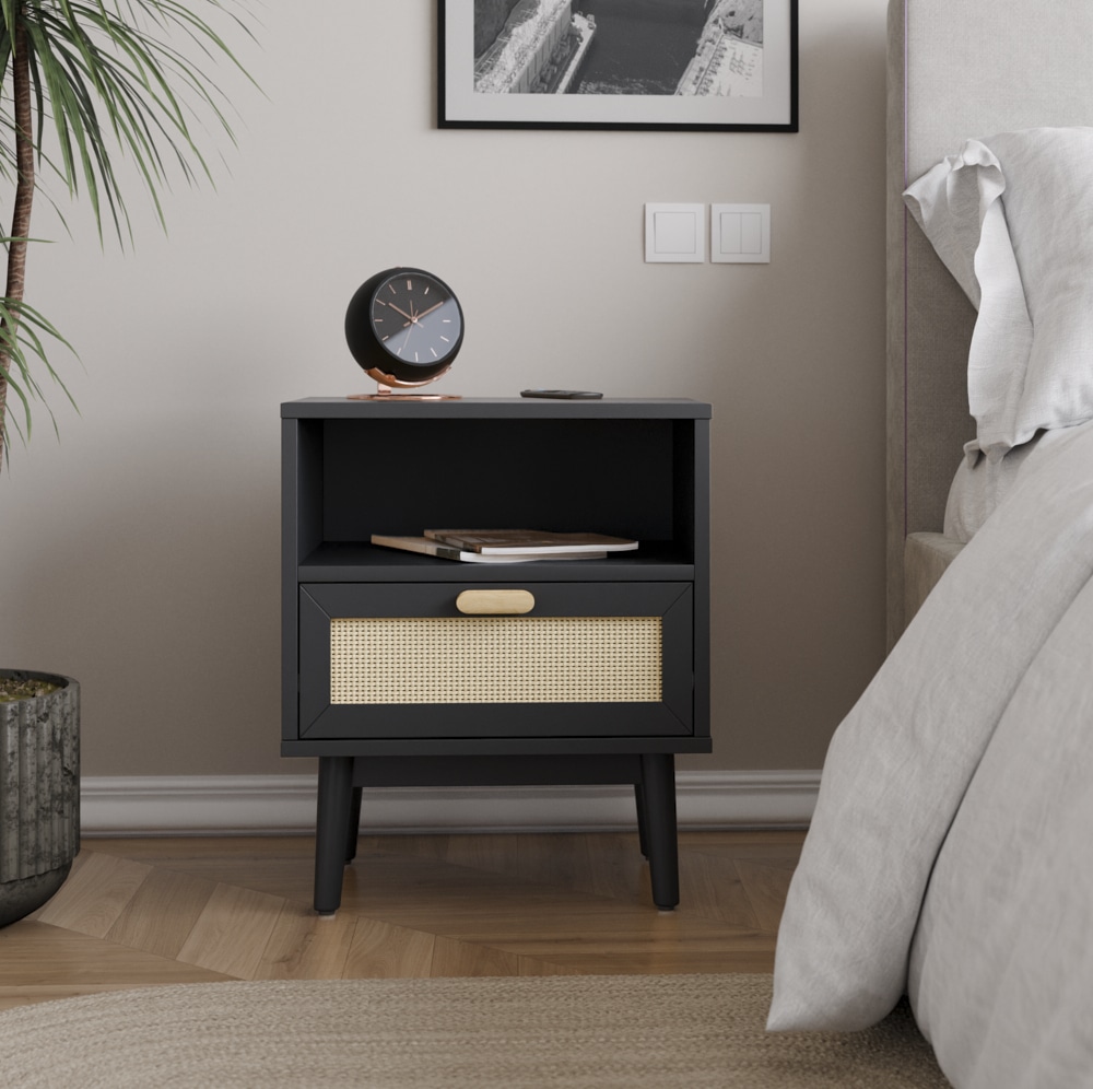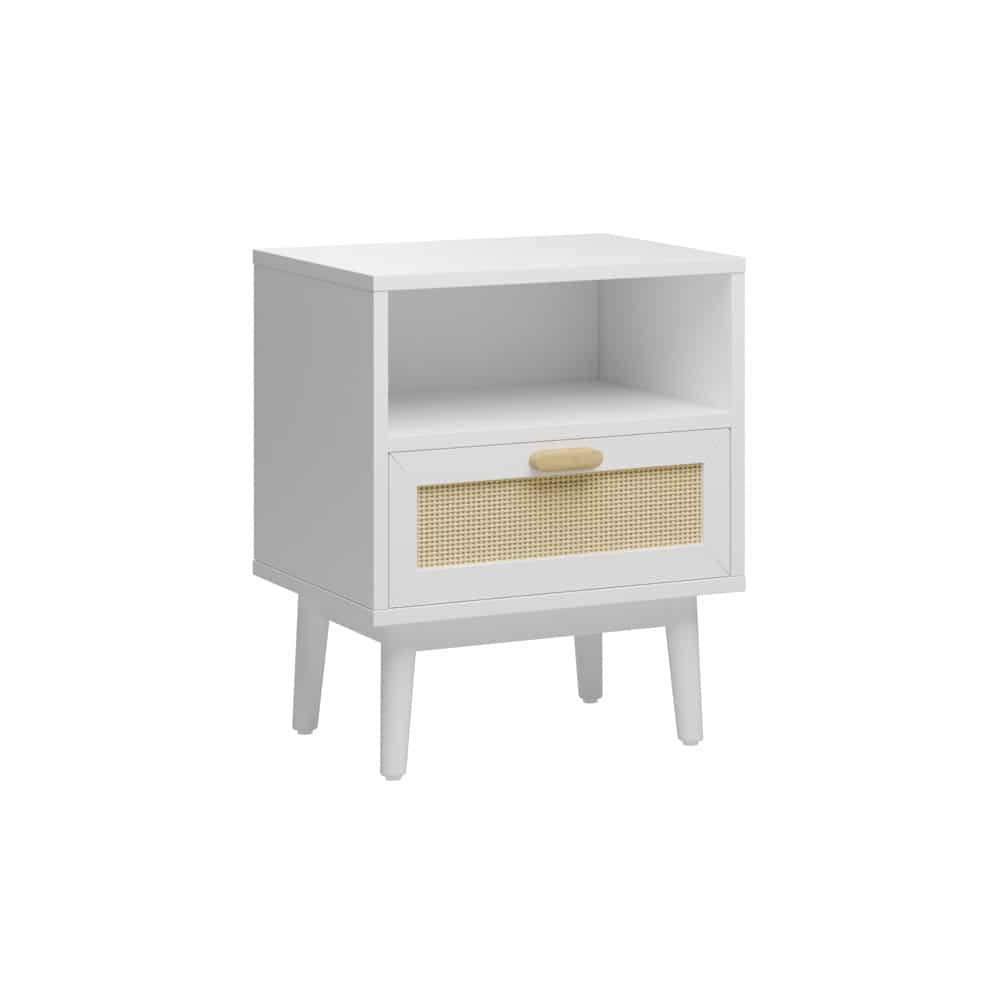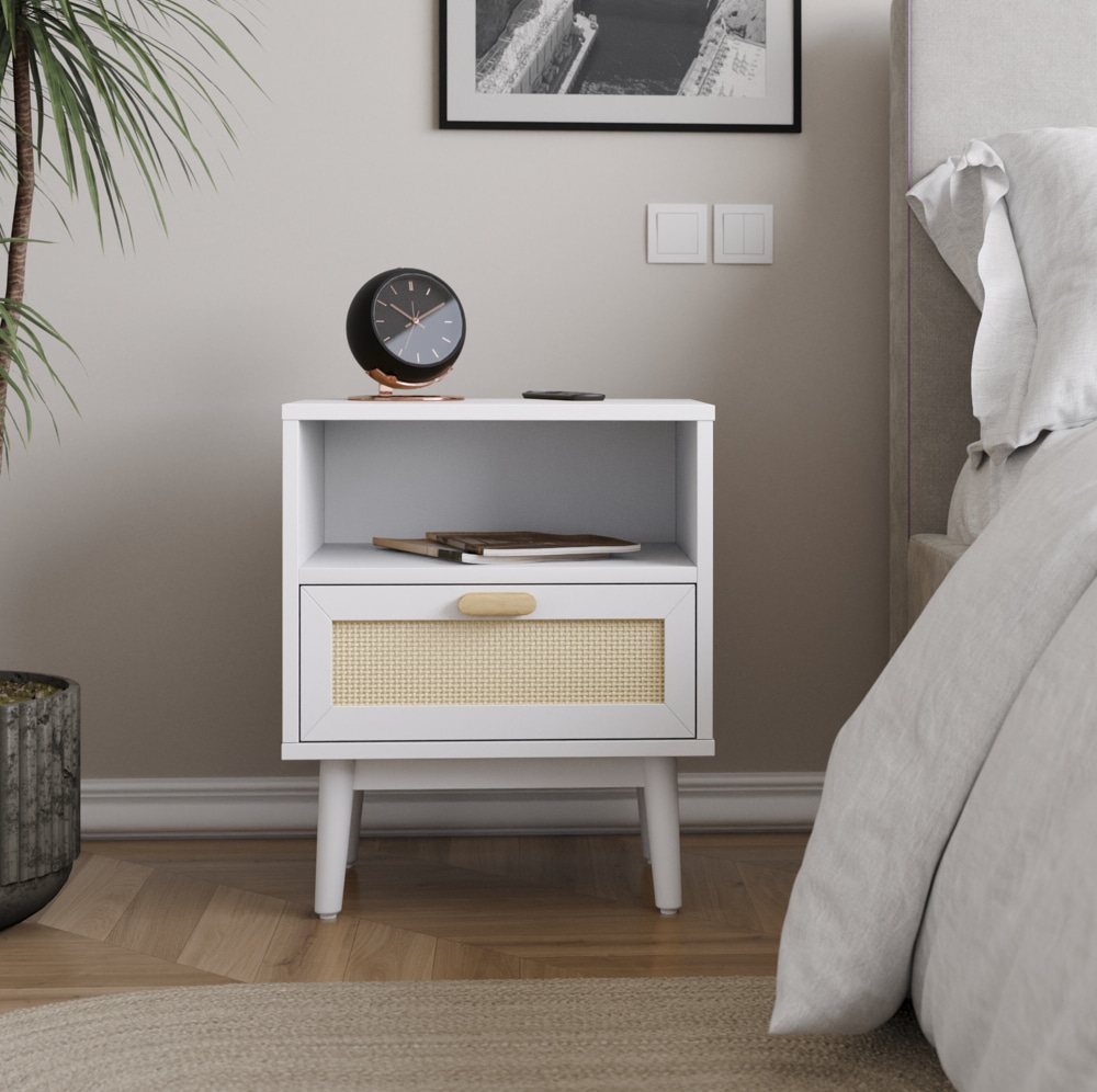 שידת לילה דגם מאי המשלבת מגירה בגימור דמוי ראטן ומדף בעל חלל אחסון בשלושה צבעים מודרניים לבחירה